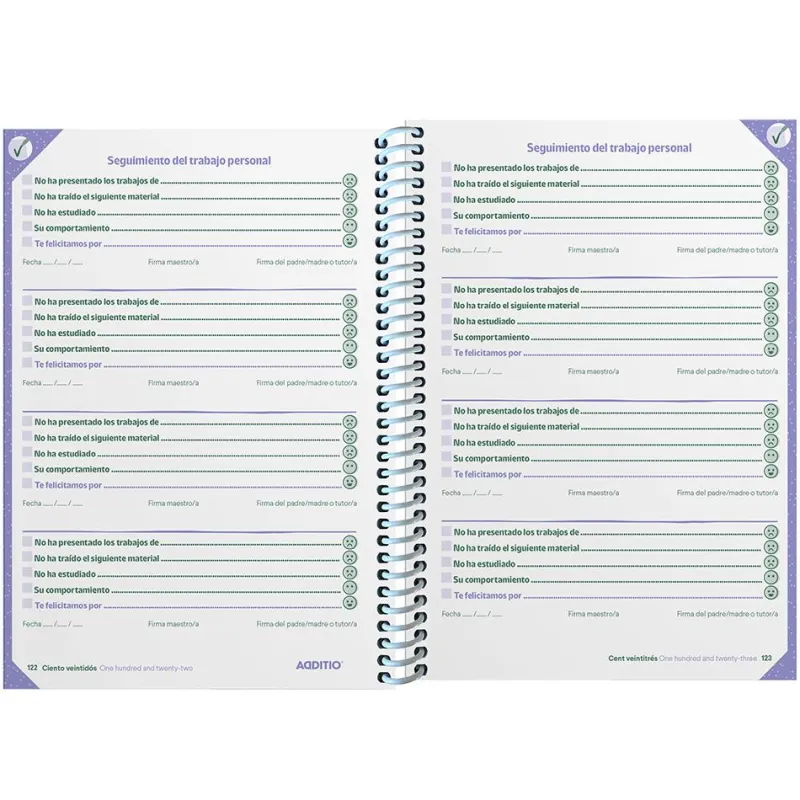 Agenda con encuadernación en espiral que incorpora horario, hojas de anotaciones, direcciones y comunicaciones a los padres. ¡Llévala contigo!