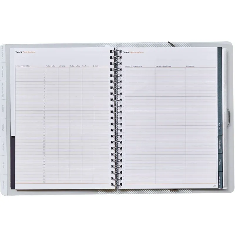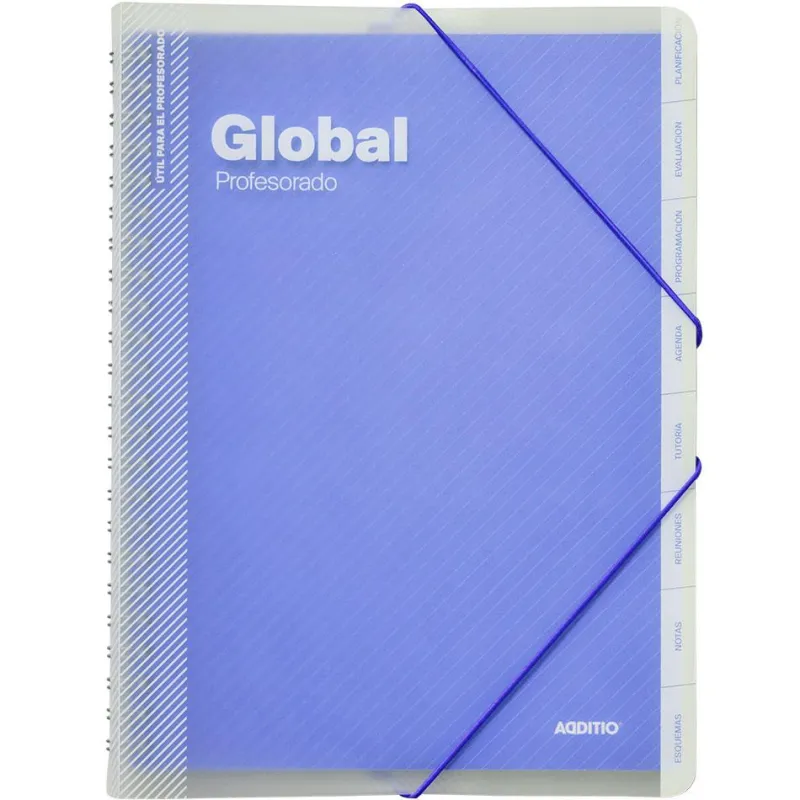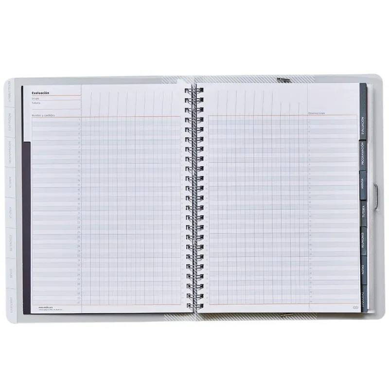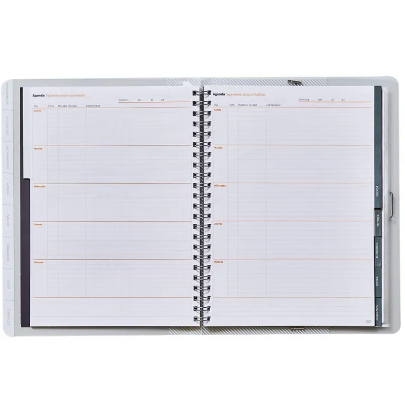 Libro para el trabajo diario del profesor. Contenido: Datos personales y horario, EVALUACIÓN continua, FOTOGRAFÍAS de los diferentes grupos, PROGRAMACIÓN por grupos o materias, TUTORÍA, FOTOGRAFÍAS del grupo, HORARIO del grupo, DATOS personales y familiares de los alumnos, ENTREVISTAS y REUNIONES. Incluye: Separadores móviles, regla marcapaginas,fundas de polipropileno transparentes para una rápida identificación y máxima carga. Colores surtidos.