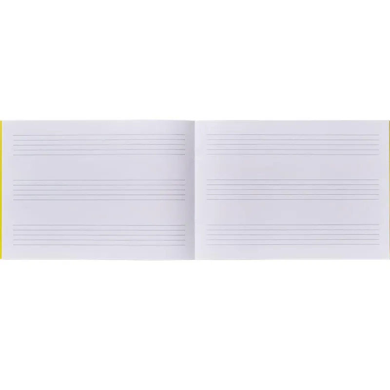 Este cuaderno tamaño cuarto apaisado encuadernado con grapa, contiene 3 pentagramas por página, de interlineado 24mm. Dimensiones: 24cm x 17cm. 20 páginas.