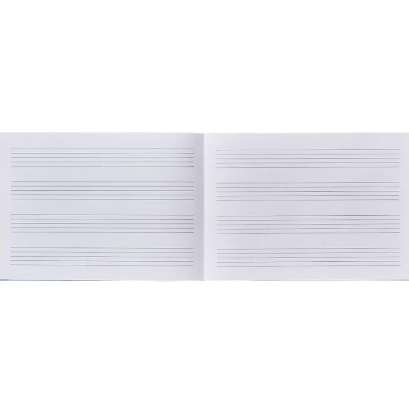 Este cuaderno tamaño cuarto apaisado encuadernado con grapa, contiene 4 pentagramas por página, de interlineado 20mm. Dimensiones: 24cm x 17cm. 20 páginas.