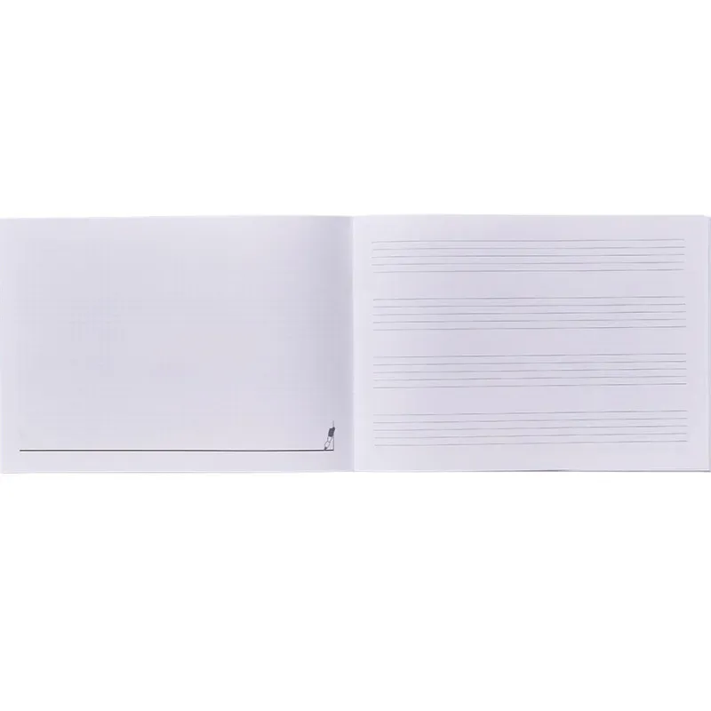 Este cuaderno tamaño cuarto apaisado, alterna hoja de 4 pentagramas con hoja microperforada, que tiene una cara para anotaciones y la otra para dibujar o pintar. Dimensiones: 24cm x 17cm.