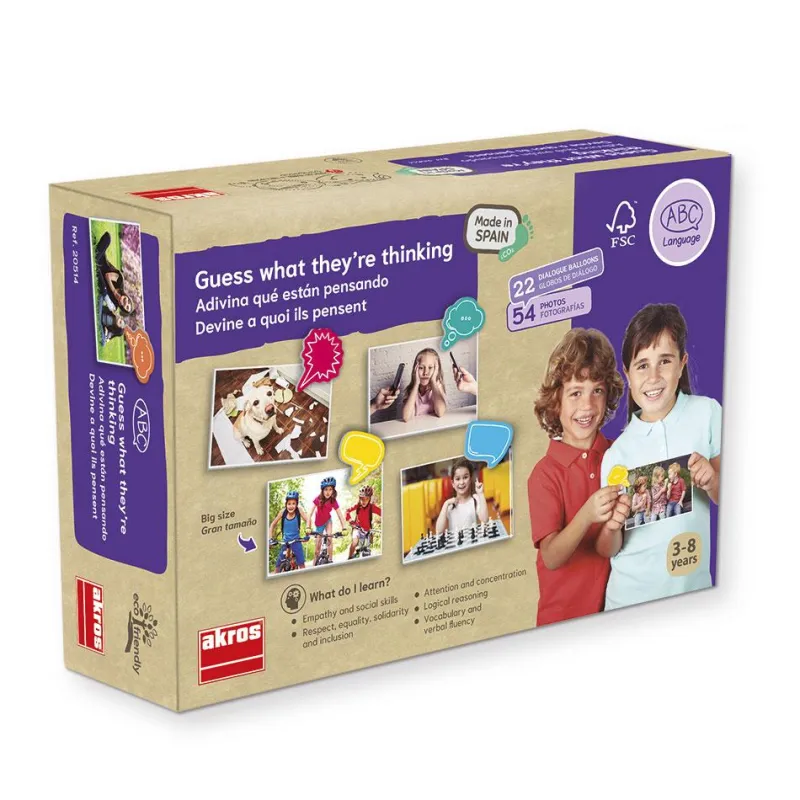 Nos encanta este juego de Akros, ya que a través de las fotografías, se desarrollarán habilidades como la comunicación, la empatía o la expresión oral. Además, permite ponerse en el lugar de los demás a través de la imaginación o la deducción, descifrando así, lo que esta pasando en cada imagen.