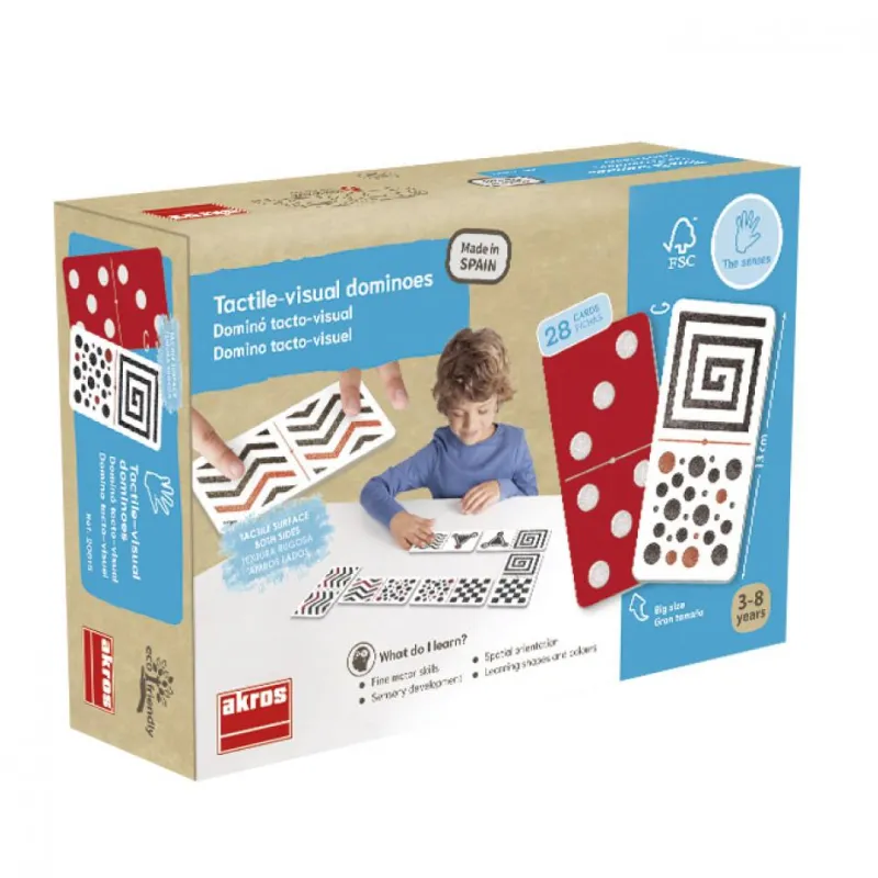 Los juegos inclusivos y educativos son los que más nos gustan, sus características facilitan la participación en de los peques con bajo nivel de visión y los peques con falta de visión. Algunos de los objetivos didácticos del dominó tacto visual es el desarrollar sensorial, trabajar la atención, la observación, orientación espacial, mejorar la memoria visual y táctil. El material de las fichas es ecológico, proveniente de bosques sostenibles y 100% reciclable.