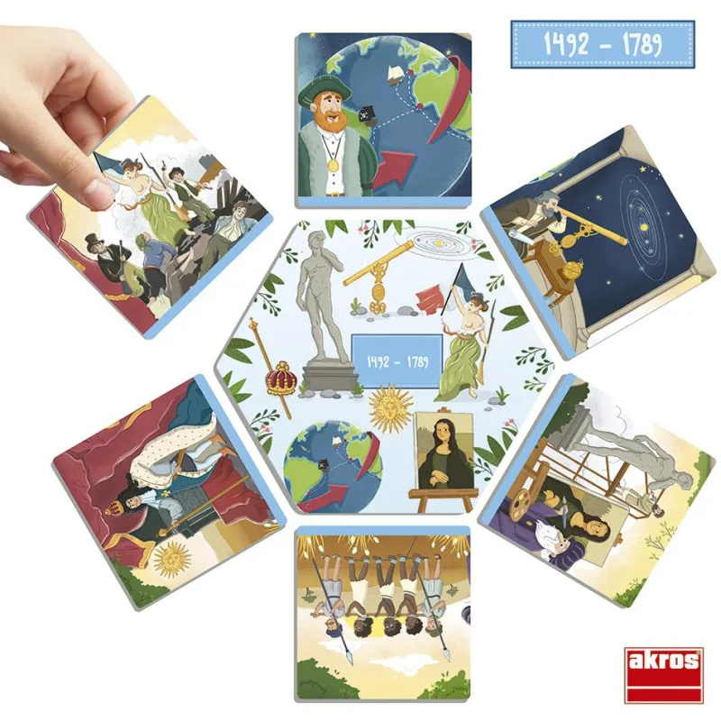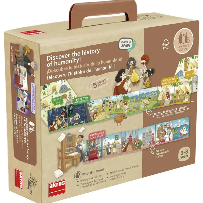 De una manera muy sencilla, este juego muestra las distintas etapas de la historia por medio de paneles ilustrados, junto a los que habrá que colocar las distintas fichas que formen parte de esa etapa y que ilustran acontecimientos relevantes a lo largo del tiempo, desde la prehistoria hasta hoy. Estas fichas también pueden clasificarse de manera cronológica como una gran línea del tiempo, ¿no es genial? Niños y niñas comprenderán mejor el paso del tiempo y la evolución de las personas y su entorno a lo largo de la historia, además de aprender sucesos de gran importancia para la humanidad. Por eso, es perfecto para que lo compartas en el aula con tus alumnos o%2