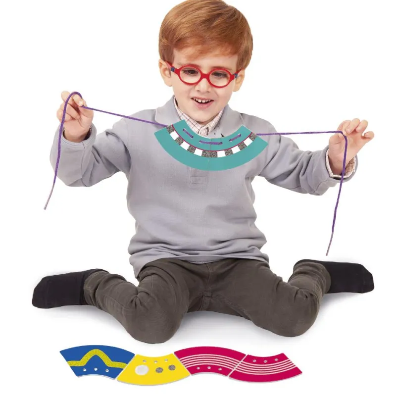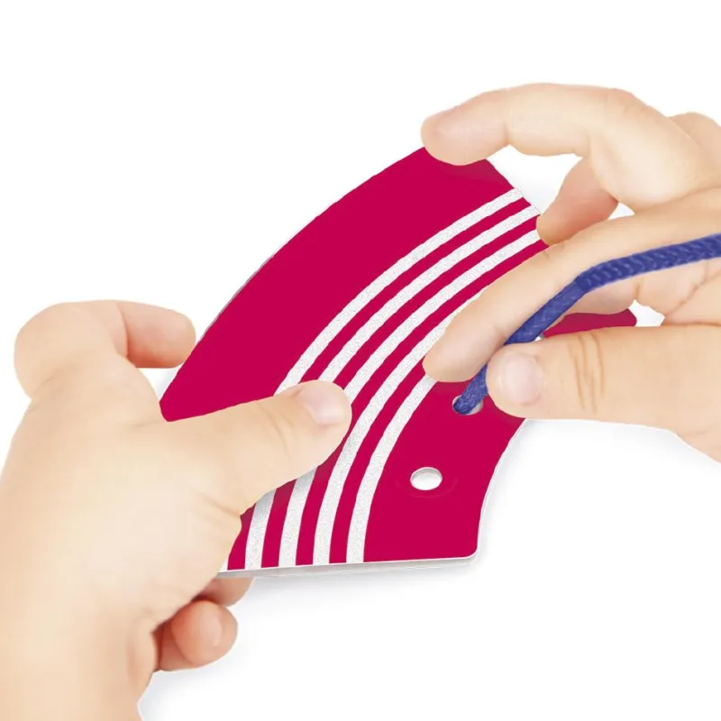 ¡Crea divertidos recorridos enlazando las fichas según colores y texturas! Solo tienes que unir las distintas piezas entre sí con el cordón para formar los caminos más locos.