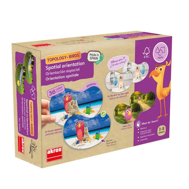 El Topology-birds es un juego idóneo para desarrollar la orientación espacial de los más peques y no tan peques, sus ilustraciones de escenarios reales con divertidos pájaros lo hace especialmente atractivo para aprender las posiciones especiales opuestas, ejercitar la memoria, la atención y la observación. El material de las fichas es ecológico, proveniente de bosques sostenibles y 100% reciclable. Juego ideal para jugar en clase o en casa.
