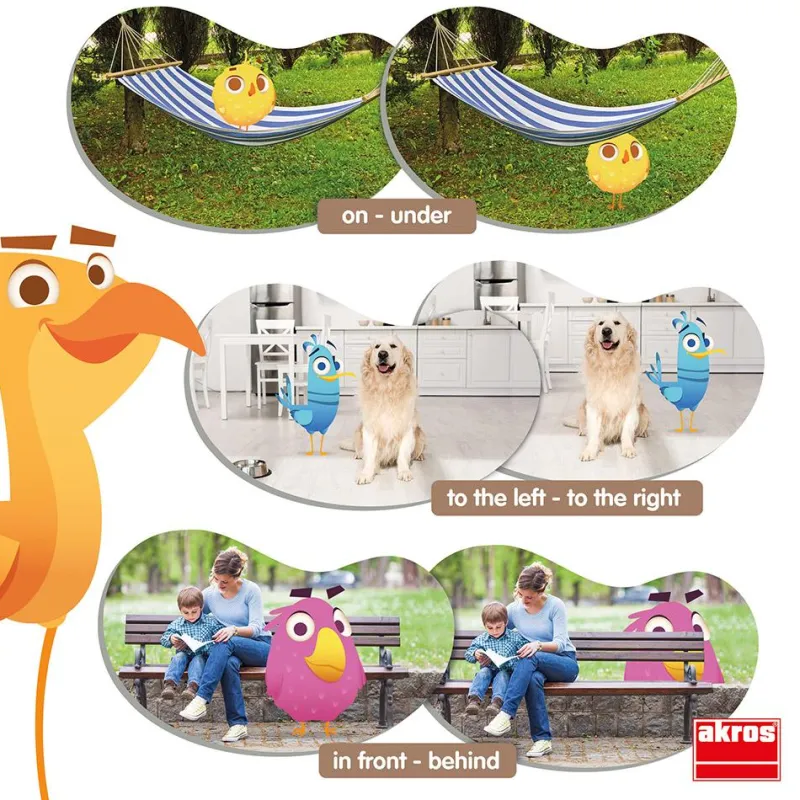Original memory para desarrollar la orientación espacial y aprender las posiciones espaciales opuestas: delante-detrás, dentro-fuera, encima-debajo, a la derecha-a la izquierda, cerca-lejos, juntos -separados. ¡Forma las parejas de los divertidos pájaros en posiciones espaciales opuestas!