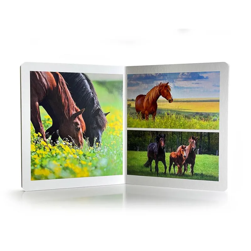 Libro con fotografías de animales que habitan en las granjas. Con varias fotografías de cada animal distribuidas a doble página.