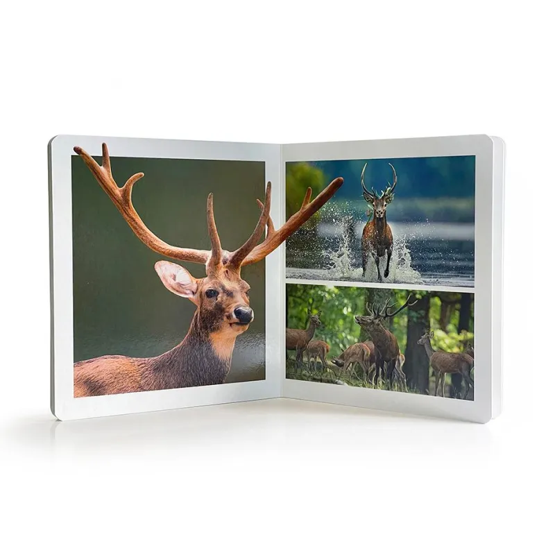 Libro con fotografías de animales que habitan en los bosques. Con varias fotografías de cada animal distribuidas a doble página.
