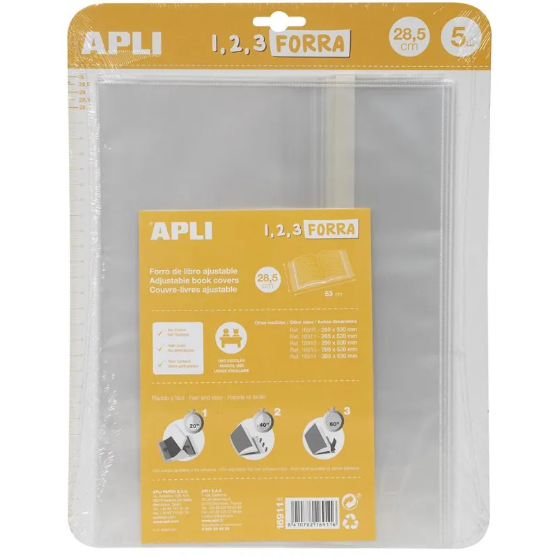 Fundas transparentes de polipropileno de 75 micras tamaño 285 mm con solapa autoajustable. Cada blíster contiene 5 fundas. La forma más fácil de forrar libros, cuadernos y carpetas, ya que se adaptan a cada ancho sin necesidad de cortar ni utilizar cinta adhesiva. Forra en solo 3 pasos: 1. Introduce las tapas del libro en las solapas 2. Ajusta el forro cerrando el libro 3. Retira la cinta y pégalo. ¡Así de fácil!