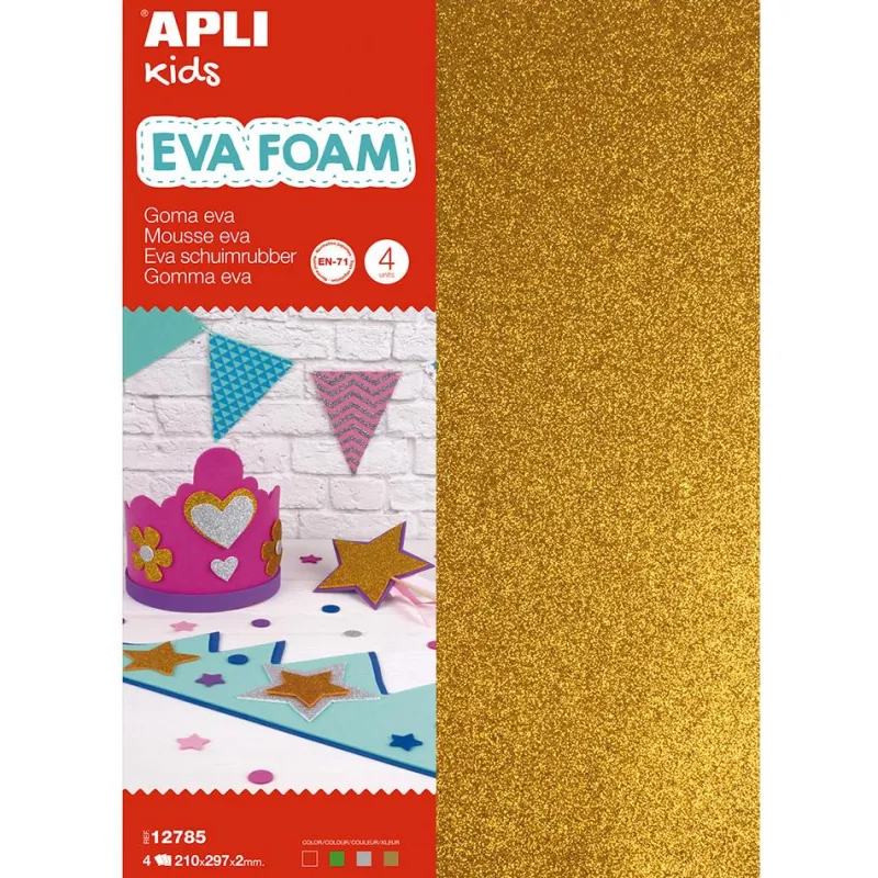 Contiene 4 láminas de colores de goma eva con purpurina de 21x30cm. y 2mm. de grosor.