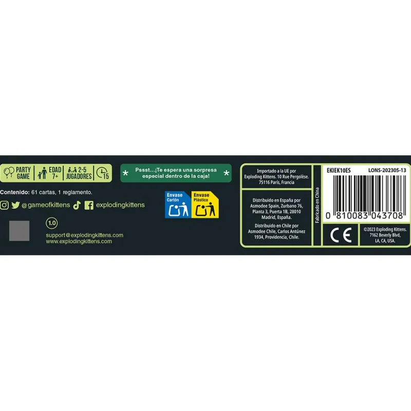 En Zombie Kittens, el azar y la estrategia se entremezclan de una forma magistral. Sus reglas son sencillas y las partidas cortas y emocionantes, lo que le aporta un componente adictivo difícil de supera, ¡Observa, planifica, actúa y confía en tu suerte! Fabricante/Representante: Asmodee Group 18 Rue Jacqueline Auriol, 78280-Guyancourt France Email: [email protected]