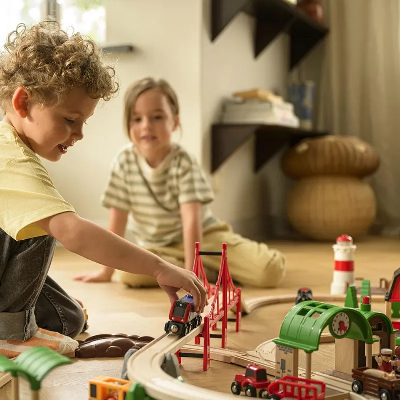 Diseñados en Suecia y fabricados con madera FSC de bosques sostenibles, los trenes BRIO son un clásico del juego que ha acompañado a generaciones. Su sistema modular permite construir circuitos infinitos, desarrollar la coordinación y fomentar la autonomía en el juego. Sin cables ni pantallas, cada pieza invita a imaginar historias, resolver pequeños retos y conectar con otros a través del juego simbólico. Una propuesta duradera, segura y llena de posibilidades para crecer jugando.