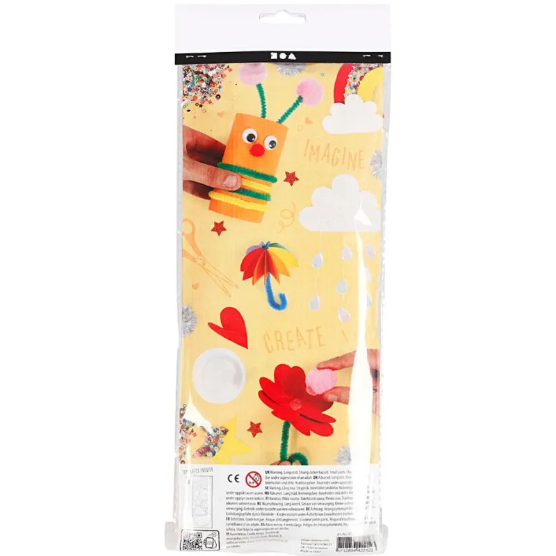Contiene diversos materiales: Formas de goma EVA adhesivas, lentejuelas, pompones, limpiapipas, papel de purpurina y ojos móviles entre otros.