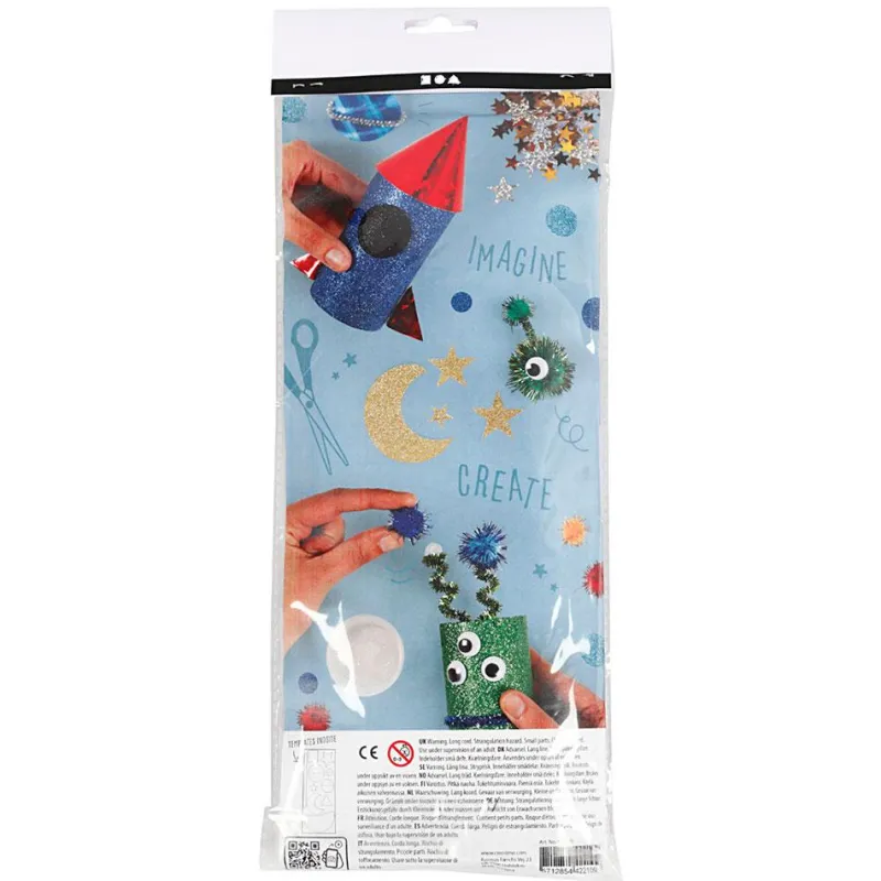 Podrás llevar a cabo un sinfín de proyectos inspirados en el Espacio, pues el material incluido está pensado para ello; solo con ver los colores y destellos en los materiales de este set, se te ocurrirán un montón de ideas: marcianos, cohetes, un paisaje sideral… ¿qué idea tomará forma primero?