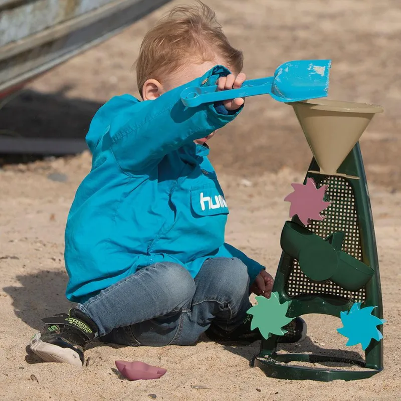 En el gran embudo que tiene en la parte superior se puede verter agua y observar cómo se ponen en movimiento las ruedas y el depósito oscilante, ¡será divertidísimo observar el recorrido que hace el agua! Incluye una pequeña pala y un molde para completar el set y favorecer la imaginación de los más pequeños.