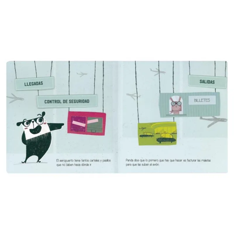 Acompaña a Coco, Leo y Panda en su primer vuelo en avión. Ayúdales a preparar la maleta, conseguir la tarjeta de embarque y conocer las instalaciones de un aeropuerto.