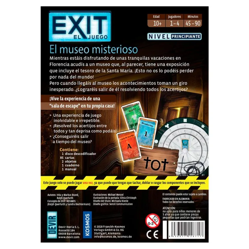 Vive la apasionante experiencia de un escape room ¡dentro de tu propia casa! En la aclamada saga de juegos Exit, cada título gira en torno a una misteriosa historia, en la que vosotros sois los protagonistas. Vuestro objetivo consiste en resolver los diferentes acertijos que se van presentando, utilizando el kit de materiales que incluye la caja.