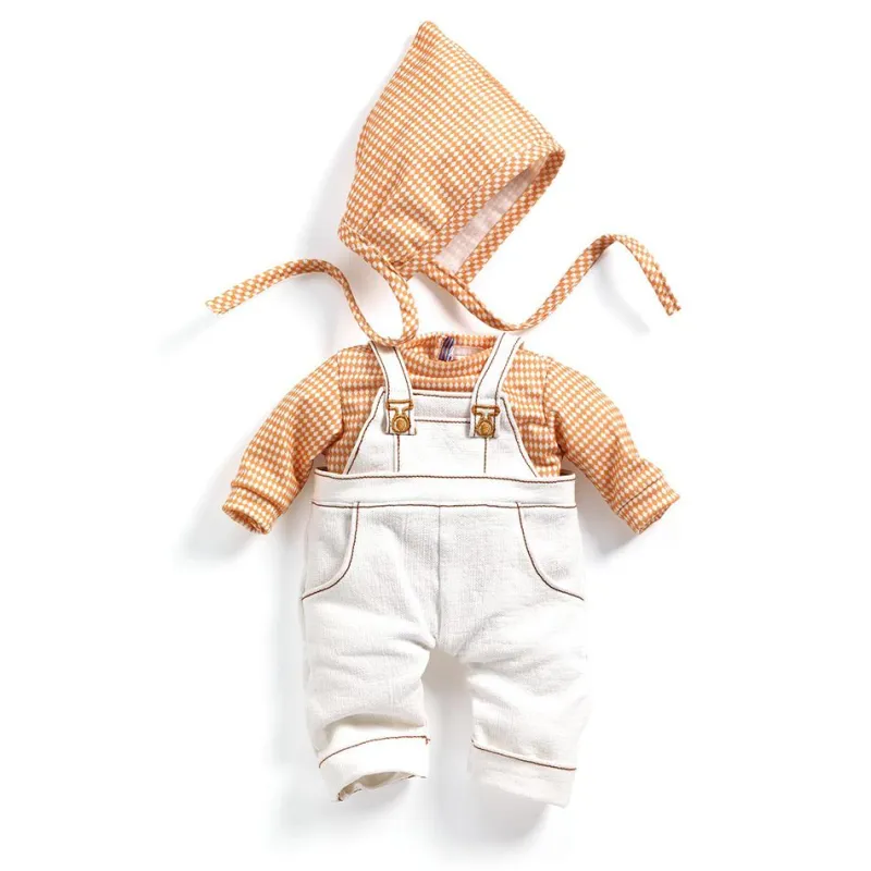 Este conjunto de peto blanco con camisa y gorro a juego en color marrón con rombos blancos es perfecto para los típicos días de otoño, para disfrutar jugando o de paseo, ¡no puede faltar en tu colección!