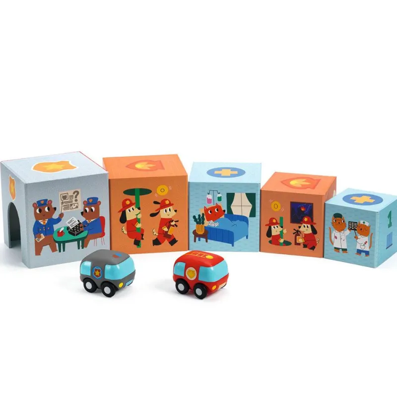Con este apilable se puede jugar de muchas formas diferentes, promoviendo distintos aspectos del aprendizaje: Colocar uno sobre otro descubriendo diferentes tamaños y colores, construir una torre con todos los cubos para después derribarla, observar las escenas de los cubos, meter y sacar los vehículos de los garajes una y otra vez… Horas de entretenimiento aseguradas.
