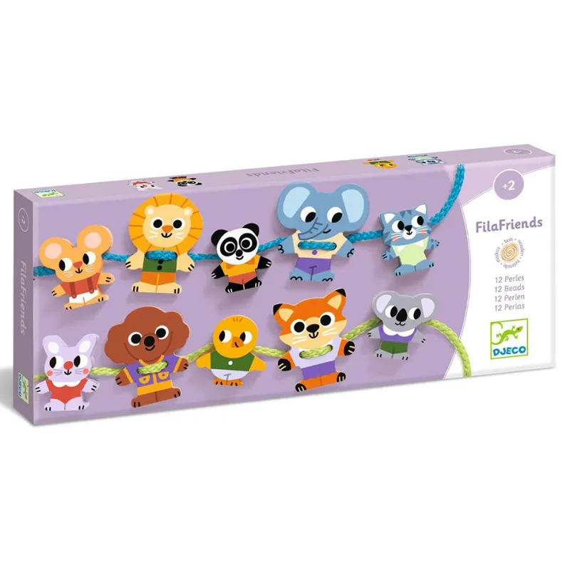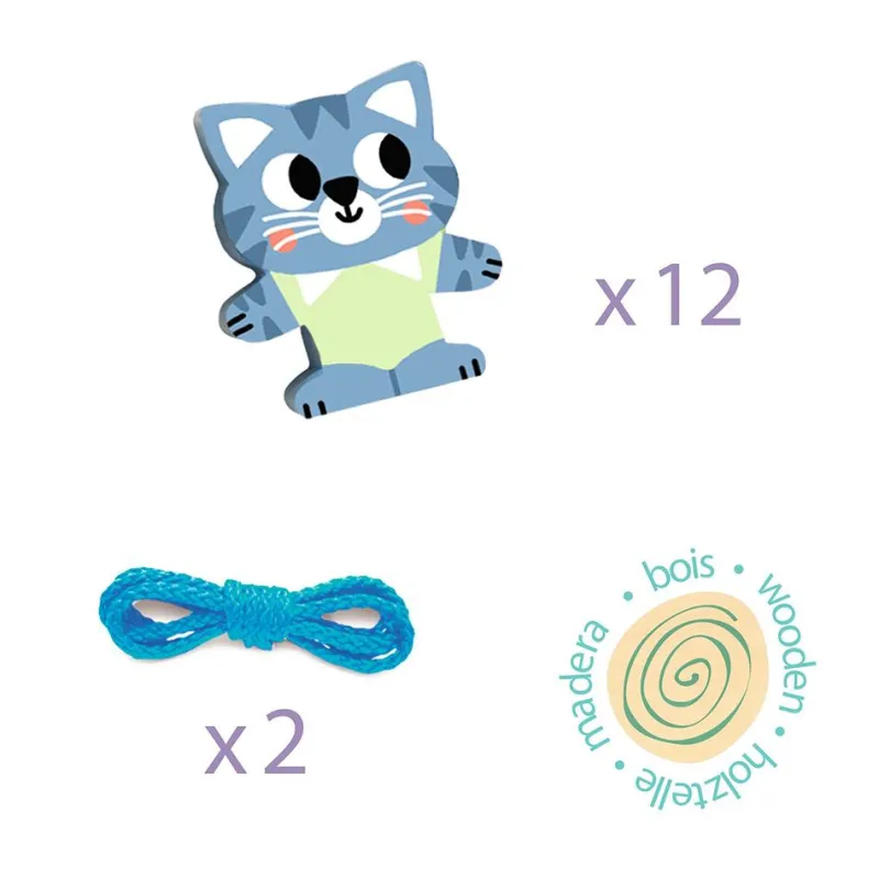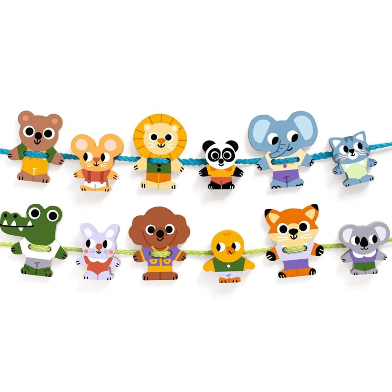 Este set está repleto de alegres animales que acompañarán a los más pequeños de la casa en sus primeros aprendizajes, ¡aprender a ensartar piezas de madera con cordones será un reto muy divertido!