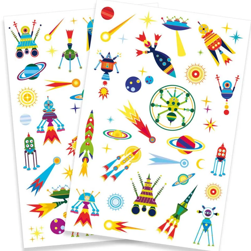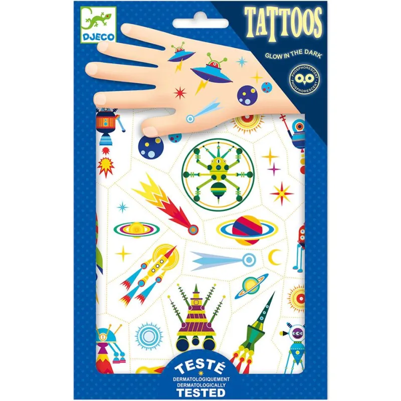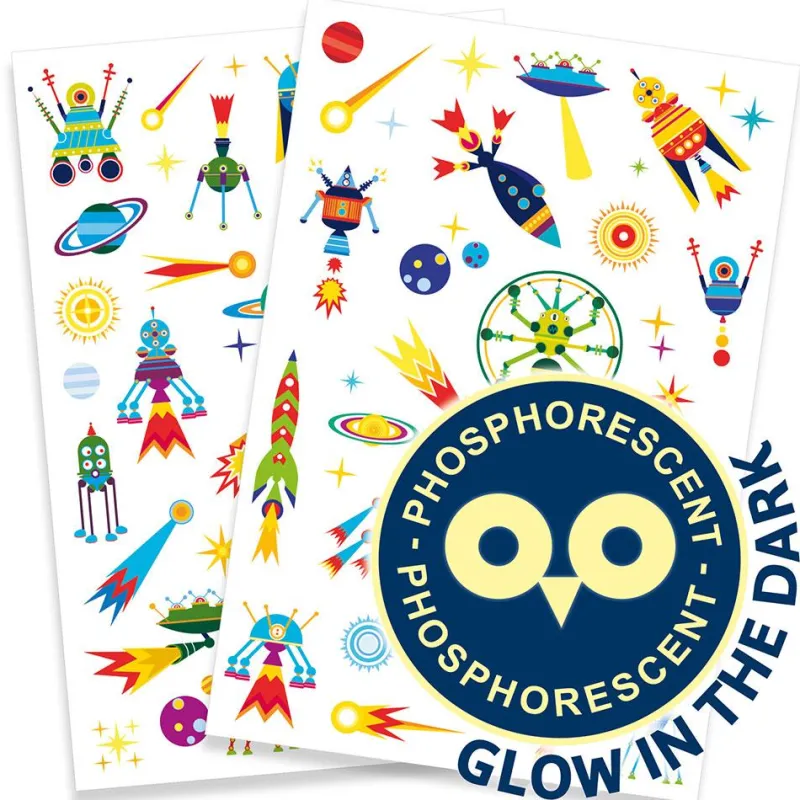 Adorna tu piel con estos encantadores tatuajes para los pequeños y pequeñas amantes del Espacio; apaga la luz y ¡mira como brillan en tu piel!