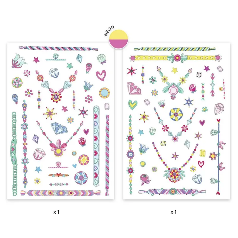 Colgantes, anillos, pulseras… ¡descubre estos y muchas formas más! Estos geniales tatuajes llenos de color quedarán fantásticos en tu mano, tu brazo… Son muy fáciles de poner: elige tu favorito para llevar en cada momento, recórtalo y despégalo suavemente del soporte blanco; aplícalo sobre la piel, humedece el reverso, presiona durante 30 segundos y ya estás preparado para lucir tu tatuaje allá donde vayas.
