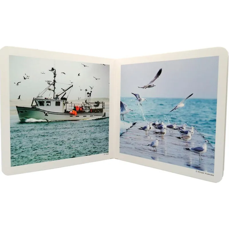 Libro de fotografías de aspectos relacionados con el mar. Se incluyen diez fotografías de: banco de peces, piragüismo, pescador, faro, embarcación, gaviotas, playa, submarinismo, coral y olas.
