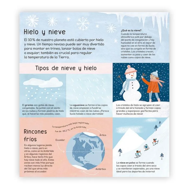 Este libro presenta los fenómenos atmosféricos de manera lúdica y breve. Ofrece la información necesaria sin perder los datos más importantes. Además, lleva ilustraciones a toda página e incluye una rueda que al girarla te sorprenderá con más información práctica y visual sobre aspectos del clima.