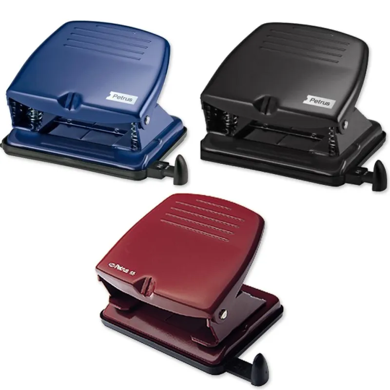 La taladradora Petrus modelo 65 de cuerpo metalico pintado perfora hasta 20 hojas, posee una cubeta de plástico para la recogida de papel.