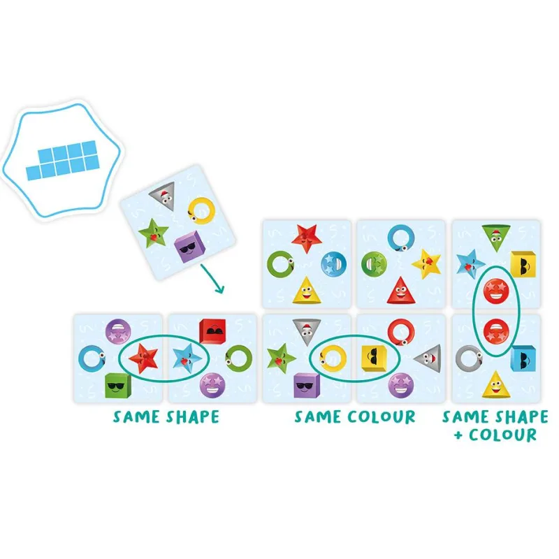 ¡Figura creada, diversión asegurada! Tendrás que ser el primer jugador en crear una carta de figura uniendo las cartas de juego, pero cuidado, el objeto o el color de las figuras que aparecen en las cartas de juego tienen que coincidir con las adyacentes.
