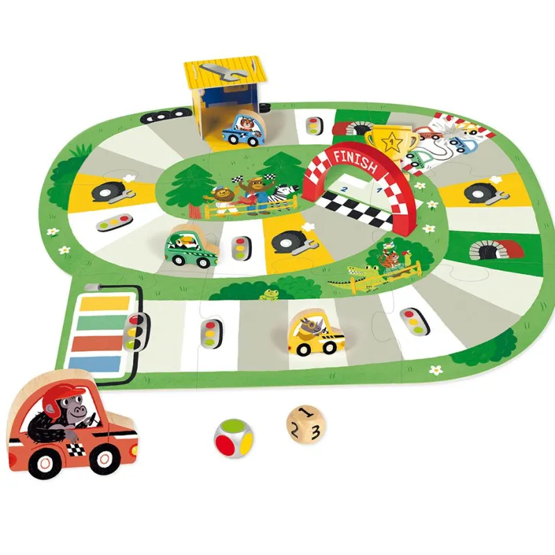 Lanza los dados, observa el número y el color que aparece, y mueve a estos salvajes corredores por el tablero como corresponda. Presta atención al tablero porque hay túneles, semáforos y posibles accidentes o averías que se cruzarán en tu camino, ¡intenta sortearlos o tendrás que acudir al taller!