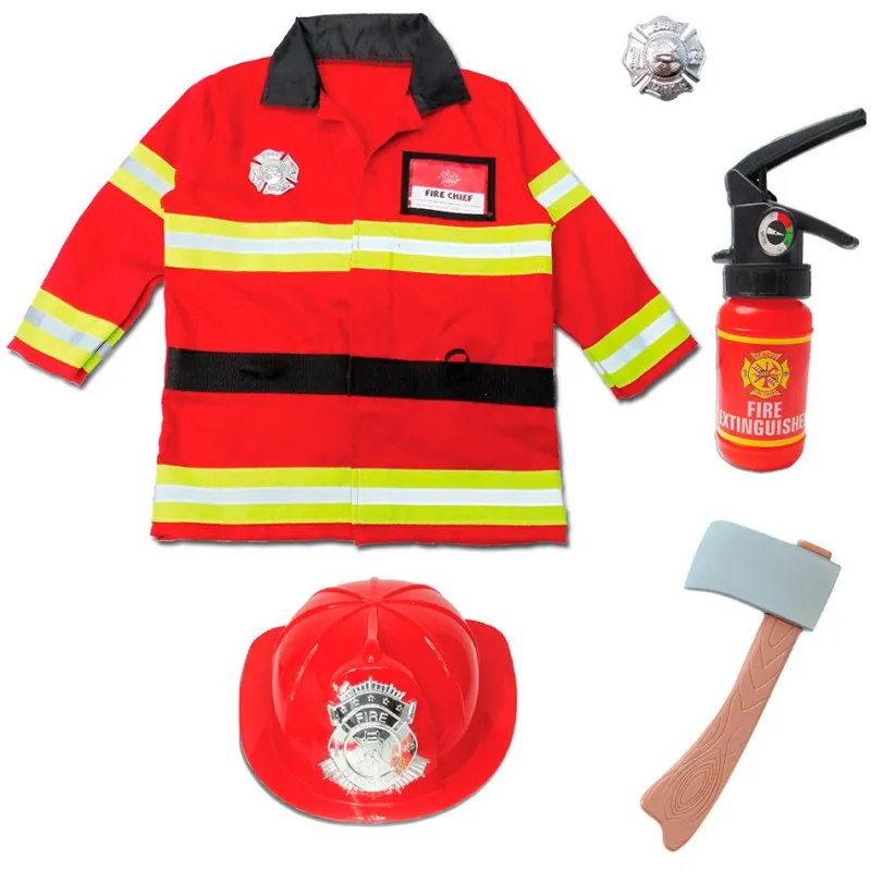 Este disfraz y sus complementos, emulan a la perfección el atuendo de los bomberos. Los disfraces son una gran herramienta para ejercitar la imaginación y las habilidades sociales de los niños y niñas, que les permiten interpretar diferentes roles, de modo que se animarán a idear sus propias historias e interpretarlas, lo que mejora su vocabulario y sus dotes creativas.