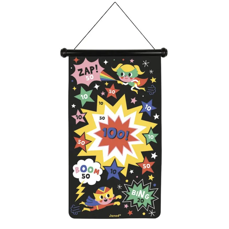 ¡Afina tu puntería con esta divertida y segura diana magnética con diseño de superhéroes! Desafía a tus amigos y familia y disfrutaréis poniendo a prueba vuestra habilidad.