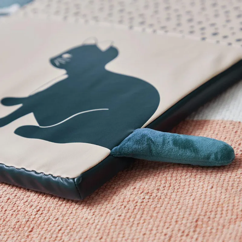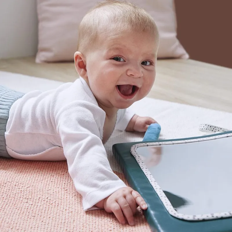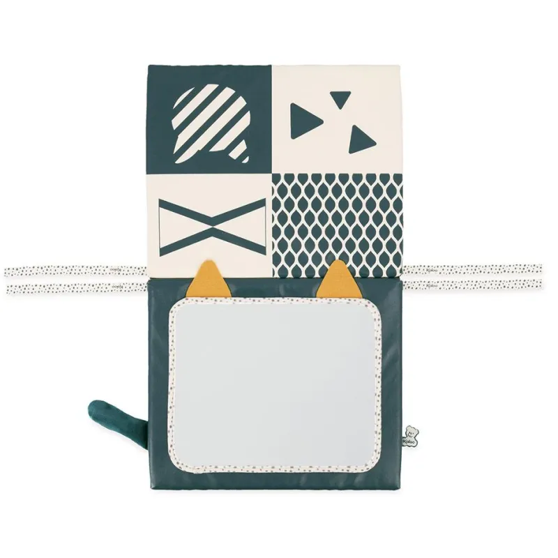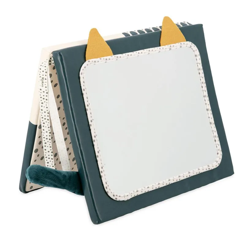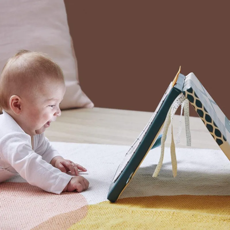 Disfruta de los primeros ratos de juego y aprendizaje de tu bebé con el mejor aliado. El espejo dispone de una base sólida que le ayudará a mantenerse de pie en el suelo, facilitando su manipulación. Está rodeado por cintas y piezas de tela suave perfectas para manipular.