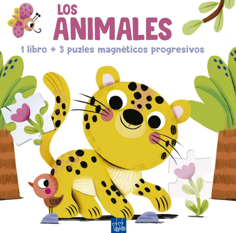 Un estuche de cartón que viene con un libro para aprender primeros conceptos sobre los animales y tres puzles magnéticos sobre escenas que encontrarás en la historia.
