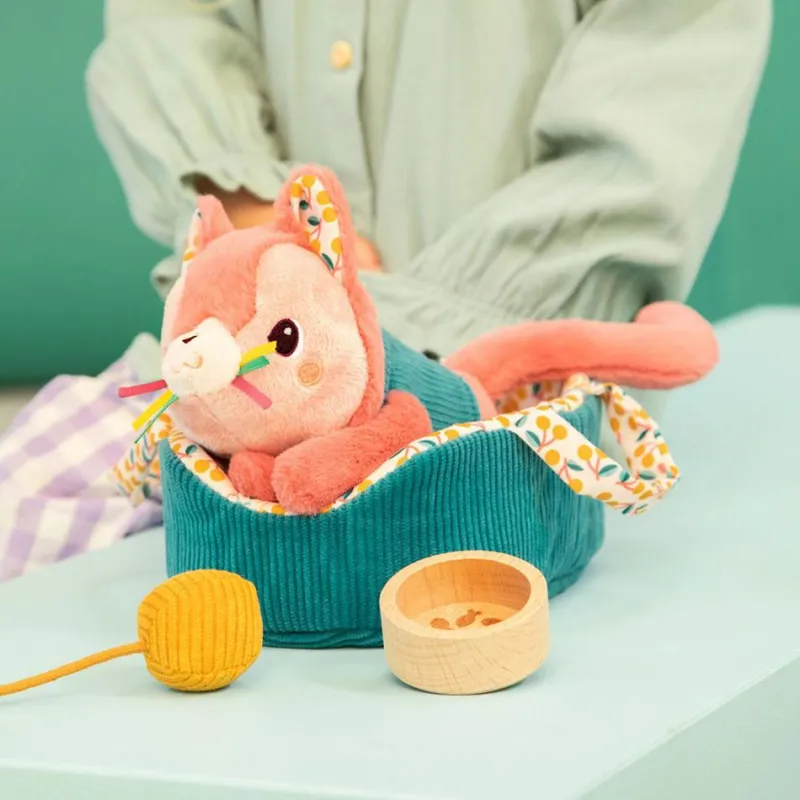 La pequeña gatita Jeanne necesita una siesta en su camita para reponer fuerzas antes de volver a jugar con su ovillo de lana, ¡seréis mejores amigos!