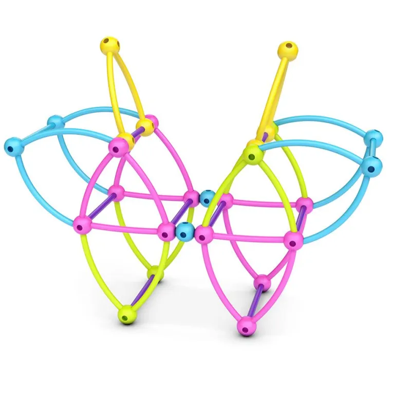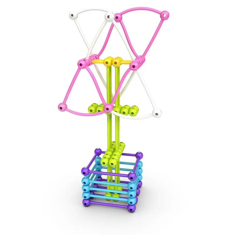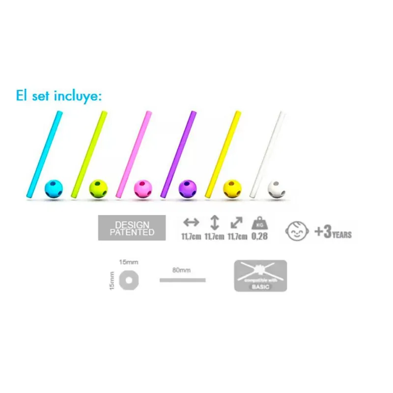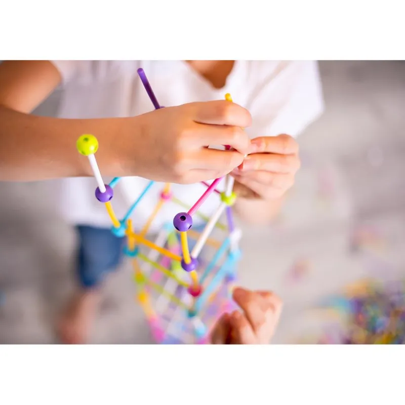 Las varillas son flexibles y están hechas a base de plástico suave, flexible y totalmente seguro, y se unen entre sí con las pequeñas esferas de colores. Cada esfera dispone de 6 agujeros para que se puedan conectar varias varillas en distintas direcciones, ¡las posibilidades de construcción son infinitas! Niños y niñas desarrollarán su habilidad manual, motricidad fina, su atención, el pensamiento lógico, la visión espacial y el razonamiento matemático casi sin darse cuenta, ¡es ideal también para compartirlo en el aula!