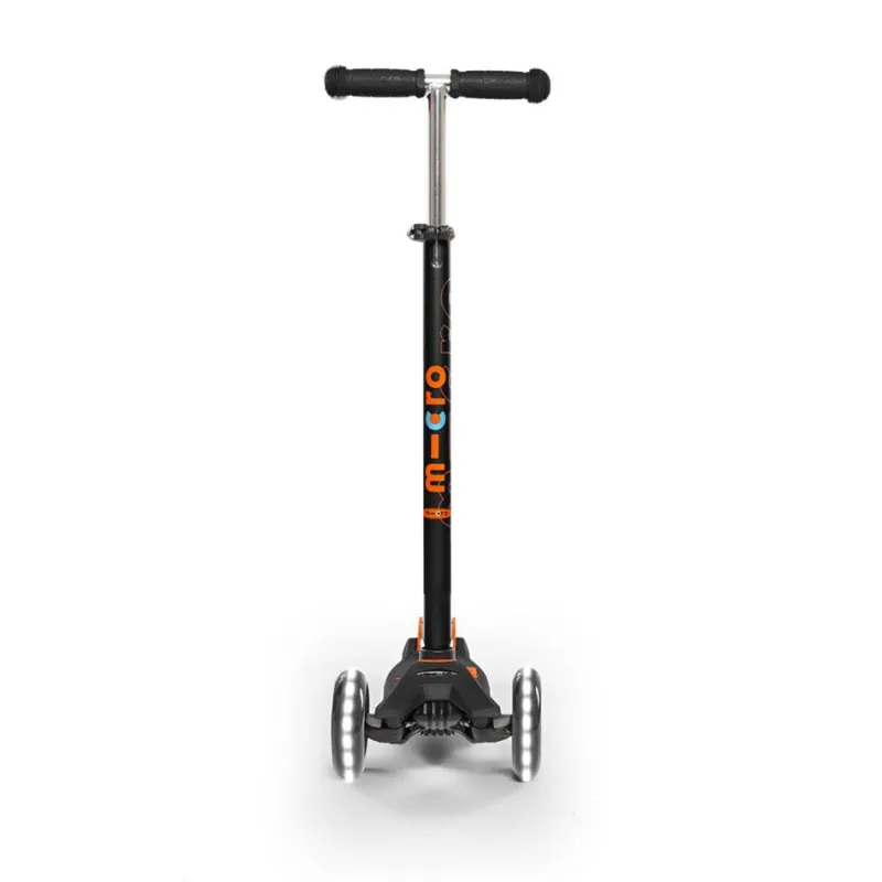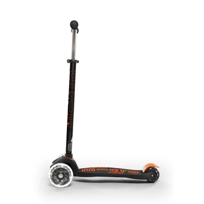 Disfruta de tus paseos en patinete con este increíble modelo Maxi Micro Deluxe en color negro y naranja, con manillar extensible… ¡y con luces LED en las ruedas!