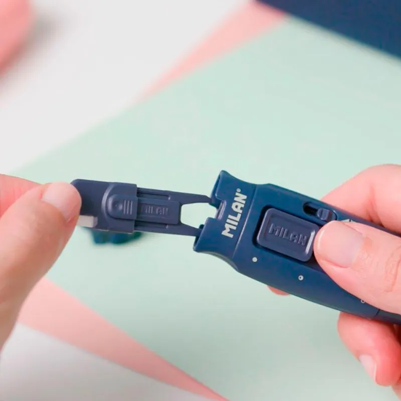Cúter con hoja de cerámica, diseño serie 1918 Milan en color azul marino, tamaño pequeño tipo bolsillo, botón deslizador con dos posiciones y cuchilla con protector y sistema de bloqueo de seguridad.