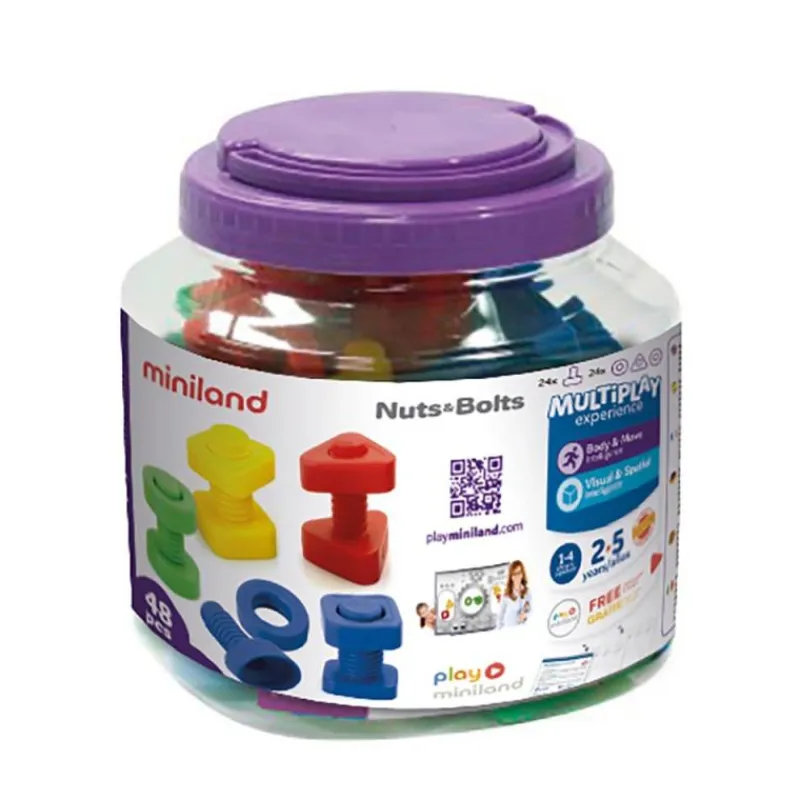 Un set de tornillos y tuercas, realizados en plástico muy resistente, perfecto para manos pequeñas y colores llamativos. Combina las piezas de diferentes colores para realizar actividades diferentes que estimulan la coordinación, la motricidad, la estimulación sensorial y la percepción visual.
