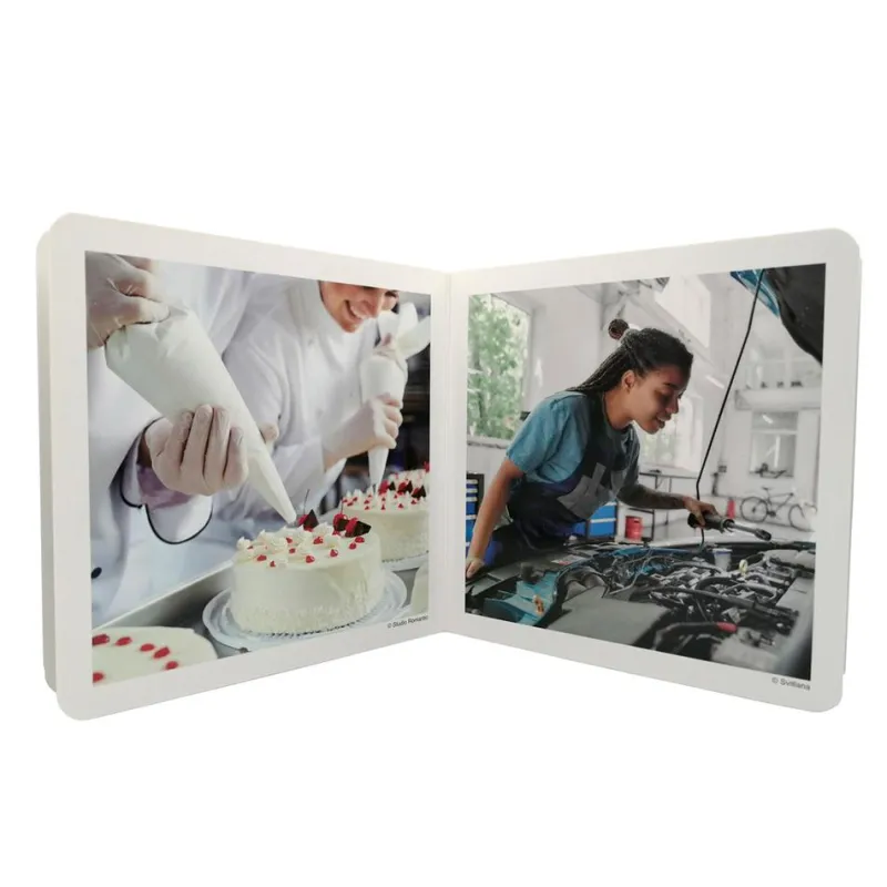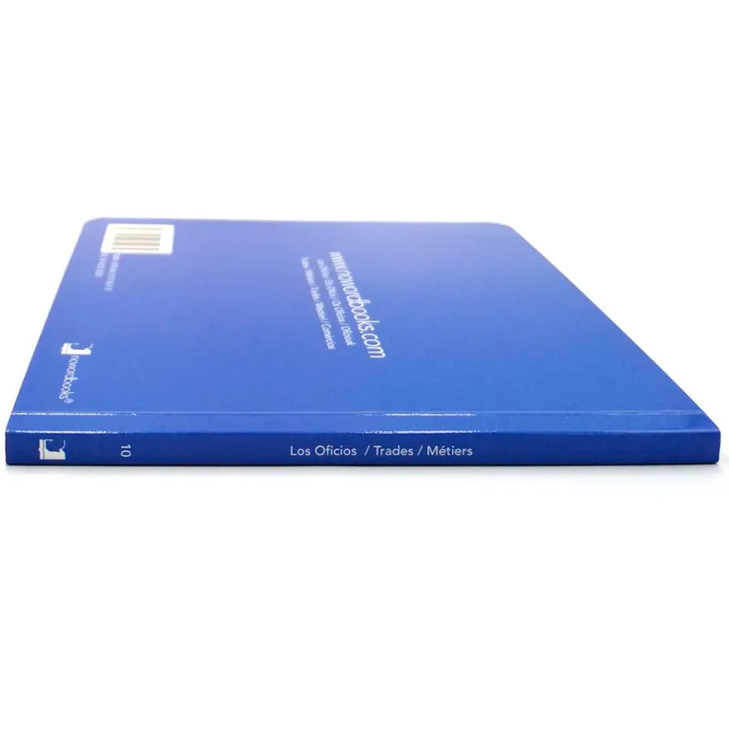Libro de fotografías con algunas de las profesiones más habituales. Se incluyen diez fotografías de: soldador (portada), bombera, cartera, escultor, pintor, pastelero, mecánica, jardinero, granjera, presentadora y panadero.