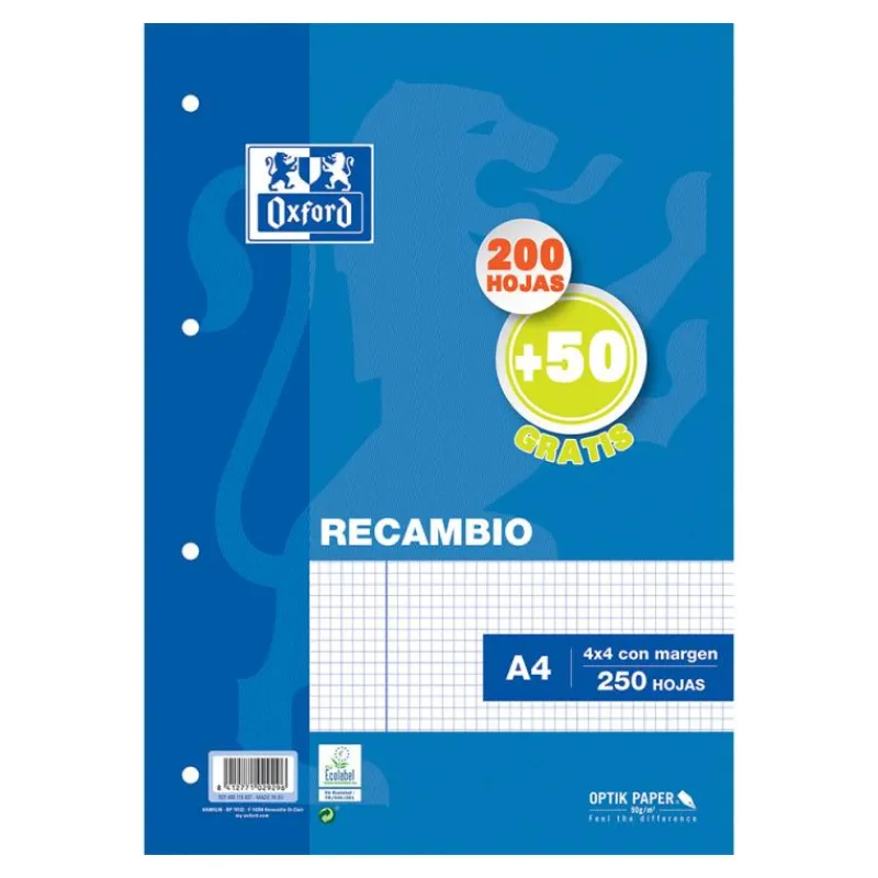 El paquete incluye un total de 250 recambios. Las hojas cuentan con margen, cuatro taladros y cuadrícula de 4×4 milímetros.