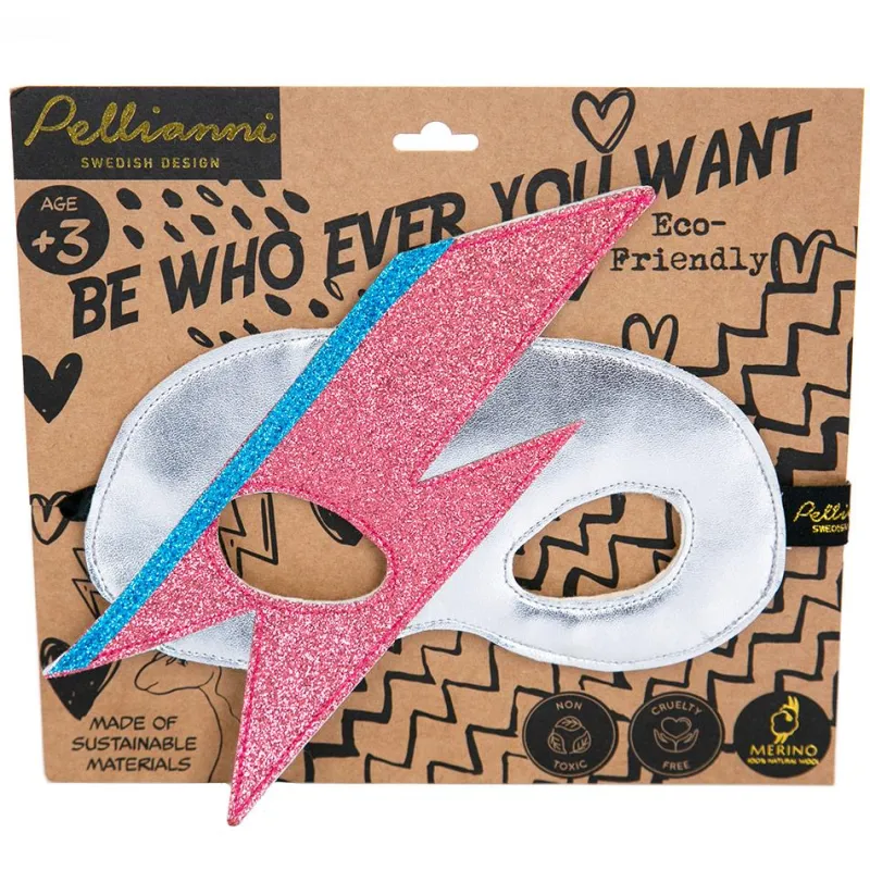 ¡Este antifaz nos ha conquistado! Es flexible pero resistente, con un diseño llamativo y centrado en la comodidad de los niños y niñas que quieran transformarse en el personaje más sorprendente. Está realizado con piel vegana, lana merina australiana natural y no tóxica, y con purpurina testada y segura para el medioambiente. En la parte trasera dispone de un elástico de goma ajustable que asegura la máxima comodidad.