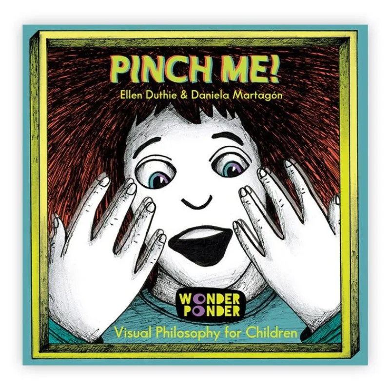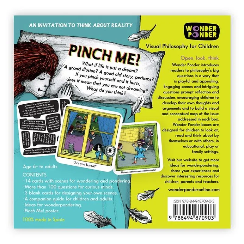What if life is just a dream? A good old story? A grand illusion, perhaps? If you pinch yourself and it hurts, does it mean that you are not dreaming?What do you think? Pinch Me! is the fourth title in the Visual Philosophy for Children series by Wonder Ponder. Half-way between a book and a game, it comes in a box and invites readers aged six and over (adults too!) to think about reality, imagination and dreaming in a playful, philosophically stimulating and literarily engaging way. Wonder Ponder introduces readers to philosophy’s big questions in a way that is fun and appealing. Engaging scenes and intriguing questions prompt reflection and discussion encouraging children to develop their own thoughts and arguments and to build a visual and conceptual map of the issue addressed in each box. Wonder Ponder boxes are designed to look at, read and think about by themselves or with others, in educational, play or family settings.