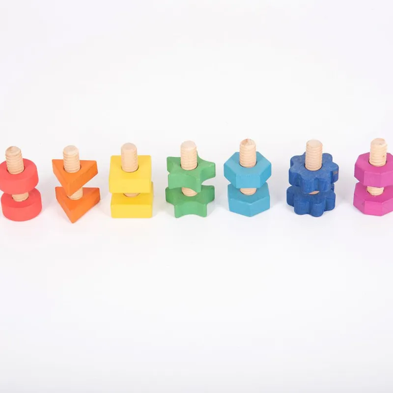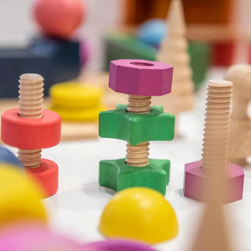 Con este set de tornillos y tuercas de gran tamaño, fabricados en madera, las manos más pequeñas podrán empezar a ensartar, organizar y clasificar, probando diferentes combinaciones de formas y colores o buscando repetir el mismo patrón; bien de forma libre, bien guiándose mediante de las instrucciones de un adulto. ¡Aprende a identificar formas geométricas!