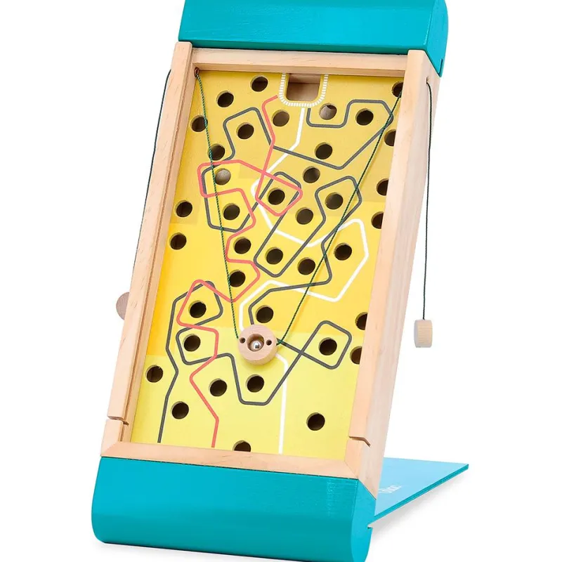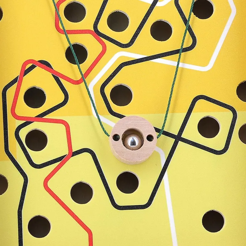 Desafía tu paciencia y escoge uno de los dos modos de juego: por un lado del laberinto y utilizando los extremos del cordón, tendrás que completar 3 recorridos de dificultad progresiva; por el otro lado del laberinto, deberás dirigir la bola de un extremo a otro del tablero inclinándolo en distintas direcciones, ¿conseguirás evitar que la bola caiga en los agujeros?