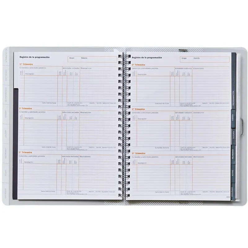 Libro para el trabajo diario del profesor. Contenido: Datos personales y horario, EVALUACIÓN continua, FOTOGRAFÍAS de los diferentes grupos, PROGRAMACIÓN por grupos o materias, TUTORÍA, FOTOGRAFÍAS del grupo, HORARIO del grupo, DATOS personales y familiares de los alumnos, ENTREVISTAS y REUNIONES. Incluye: Separadores móviles, regla marcapaginas,fundas de polipropileno transparentes para una rápida identificación y máxima carga. Colores surtidos.