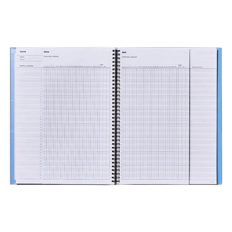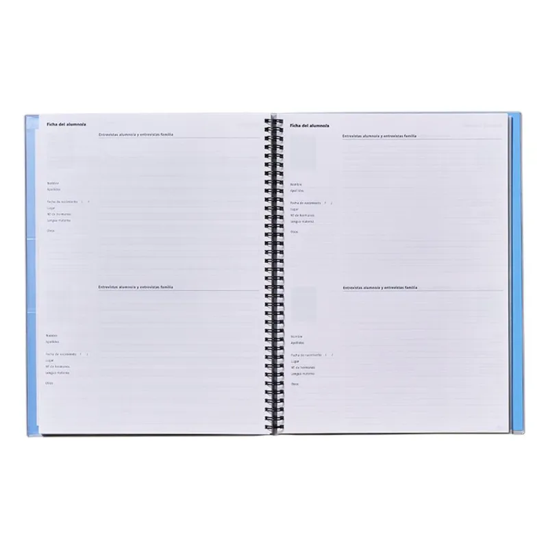 Incluye 6 fundas de polipropileno transparente, etiquetas autoadhesivas para el listado de alumnos y calendario 3 años vista.