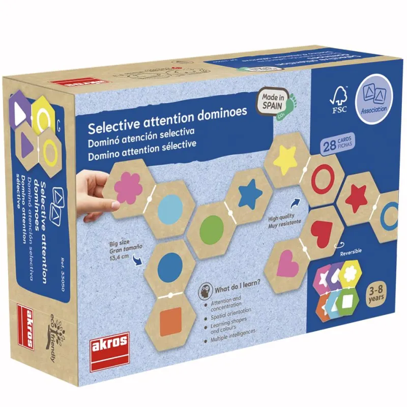 Este divertido dominó está especialmente diseñado apra trabajar la atención selectiva a través de la asociación de diferentes formas y colores. Niños y niñas dirigirán la atención a un atributo, la forma o el color, para realizar la asociación; de esa manera desarrollarán la atención, la concentración y la visión espacial de forma lúdica. El tamaño de las fichas es grande y son de cartón resistente, por lo que es ideal para personas con necesidades especiales de cualquier edad.